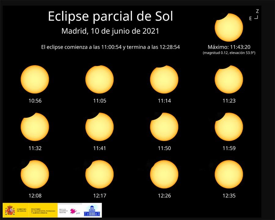 En Madrid, por ejemplo, el eclipse se iniciará a las 11.01 horas, el máximo se dará a las 11.43 horas (momento en que la magnitud será de 0,12) y finalizará a las 12.29 horas, siendo su duración total de 88 minutos, algo menos de una hora y media.