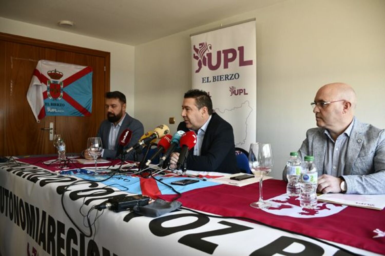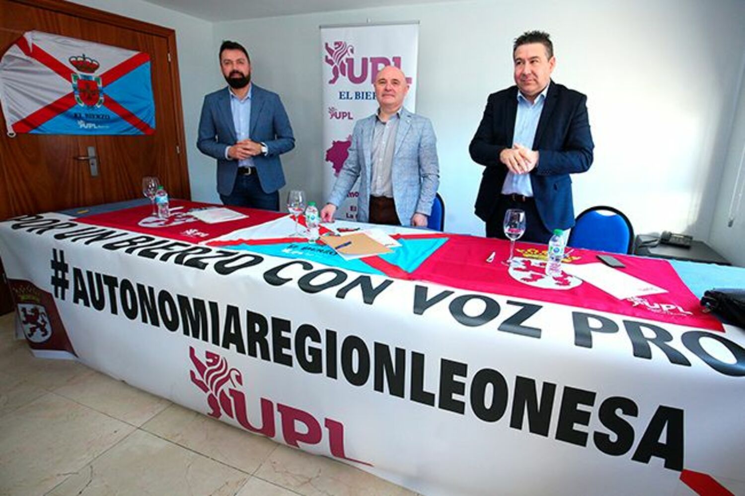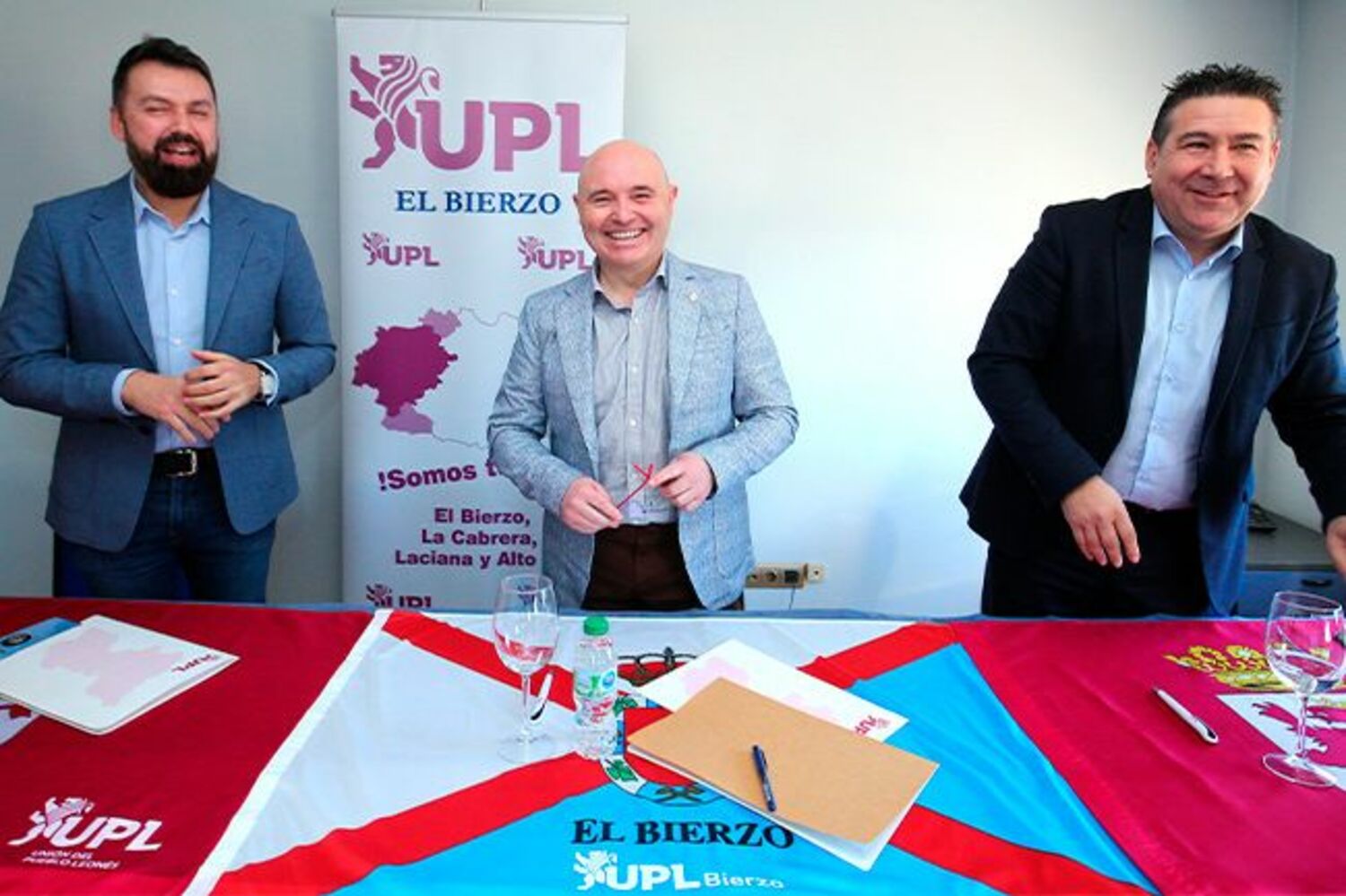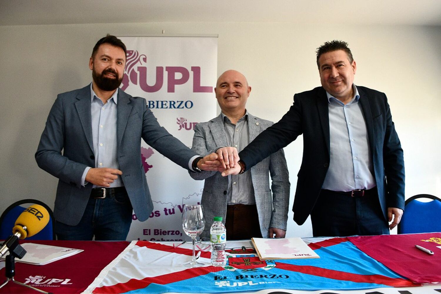 César Sánchez / ICAL. El secretario general de Unión del Pueblo Leonés, Luis Mariano Santos (D), junto al secretario comarcal de El Bierzo y procurador en las Cortes de Castilla y León, José Ramón García (I), presentan al candidato a la Alcaldía de Ponferrada para las próximas elecciones municipales, Manuel Ferreiro (C)