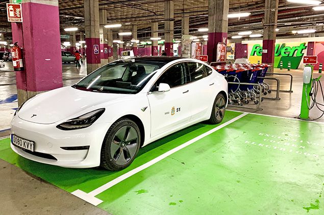 El taxi eléctrico cargándose en el punto del CC El Rosal / Mario de la Torre
