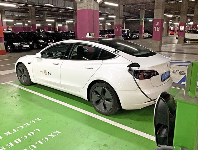 El taxi eléctrico cargándose en el punto del CC El Rosal / Mario de la Torre