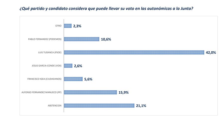 Respecto a las Elecciones Autonómicas, un 42% de los encuestados apuesta por el PSOE de Luis Tudanca; seguido de Alfonso Fernández Mañueco (PP) con un 15,9% y Pablo Fernández de Podemos (10,6%).