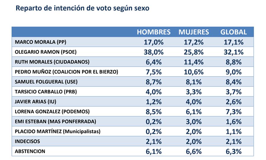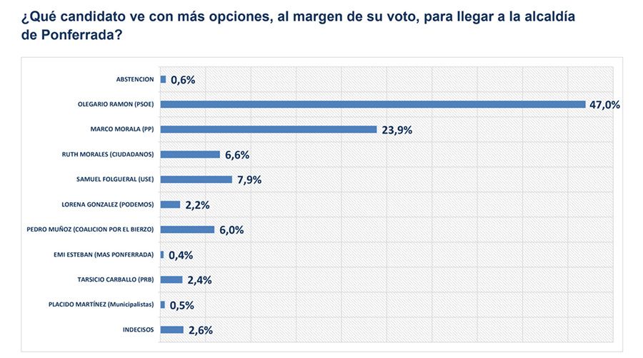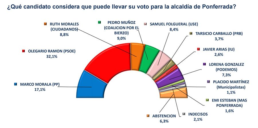 El PSOE, con Olegario Ramón al frente, ganaría las Elecciones Municipales de Ponferrada con un 32,1% de intención de voto, según los datos que recopila la encuesta realizada por la empresa Huaris para InfoBierzo. La segunda opción, a cierta distancia en intención de voto, es la de Marco Morala, que ha recibido el 17,1% de los apoyos entre los encuestados.
