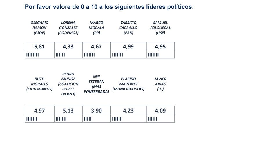 Los menos valorados son Emi Esteban de Mas Ponferrada con un 3'9 y Javier Arias de IU con un 4'09.