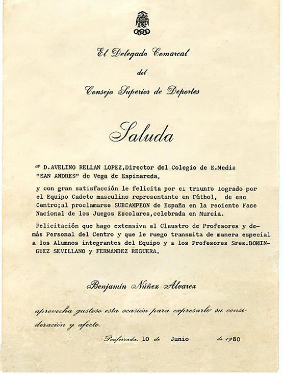 Carta de felicitación al colegio por su triunfo deportivo en Murcia