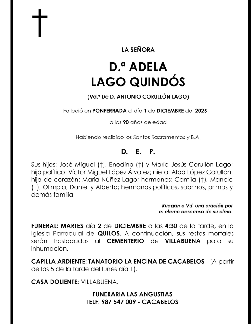 Esquelas ADELA LAGO QUINDÓS Redacción Infobierzo 01 de Diciembre de 2025 Actualizado: 01 de Diciembre de 2025 a las 19:07 Comentarios Guardar ADELA LAGO QUINDÓS ADELA LAGO QUINDÓS Temas Esquelas Bierzo Esquelas Ponferrada Esquelas