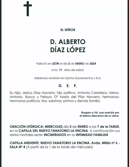 Esquelas ALBERTO DIAZ LOPEZ 03 de Enero de 2024 Comentarios Guardar ALBERTO DIAZ LOPEZ Temas Esquelas Bierzo Esquelas Ponferrada Esquelas