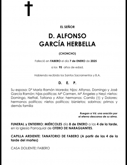 Esquelas ALFONSO GARCIA HERBELLA Redacción Infobierzo 07 de Enero de 2025 Comentarios Guardar ALFONSO GARCIA HERBELLA Temas Esquelas Bierzo Esquelas Ponferrada Esquelas