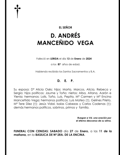Esquelas ANDRES MANCEÑIDO VEGA 25 de Enero de 2024 Comentarios Guardar ANDRES MANCEÑIDO VEGA Temas Esquelas Bierzo Esquelas Ponferrada Esquelas