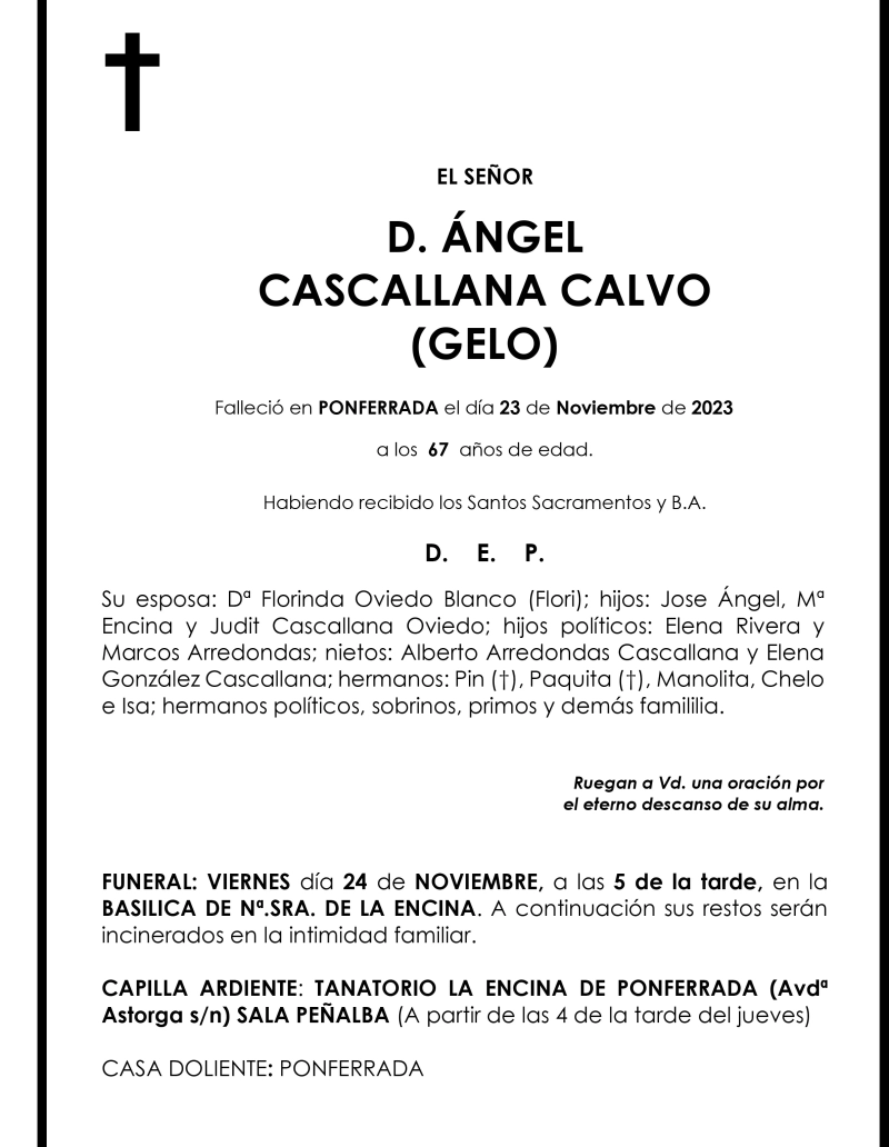 Esquelas ANGEL CASCALLANA CALVO 23 de Noviembre de 2023 Comentarios Guardar ANGEL CASCALLANA CALVO Temas Esquelas Bierzo Esquelas Ponferrada Esquelas