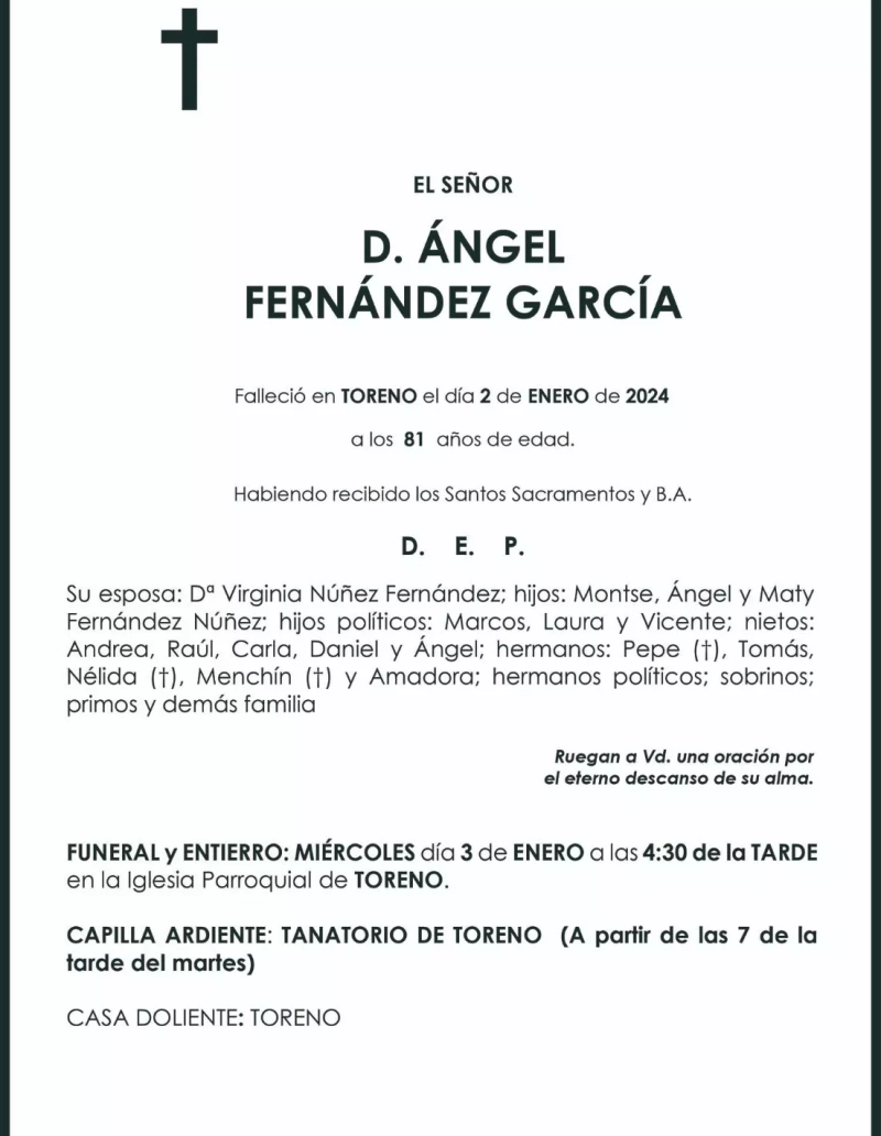 Esquelas ANGEL FERNANDEZ GARCIA 02 de Enero de 2024 Comentarios Guardar ANGEL FERNANDEZ GARCIA Temas Esquelas Bierzo Esquelas Ponferrada Esquelas