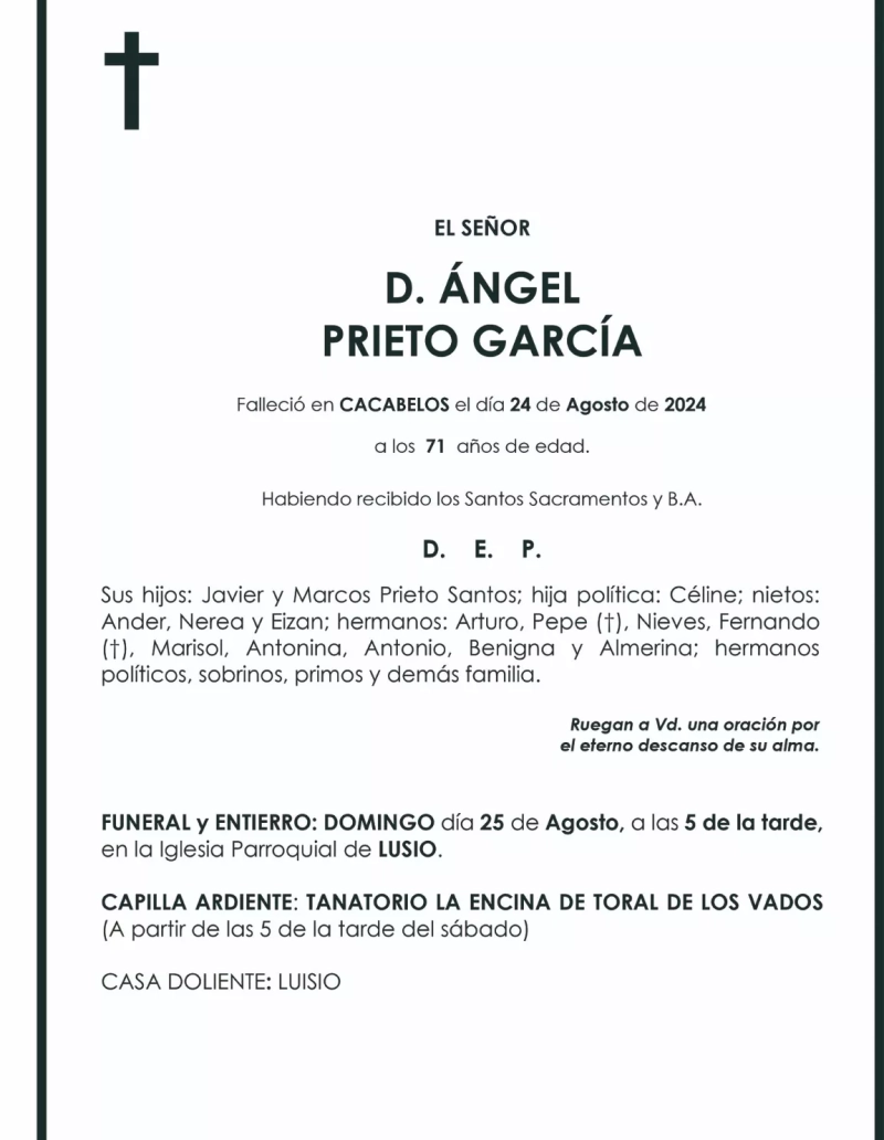 Esquelas ANGEL PRIETO GARCIA 24 de Agosto de 2024 Comentarios Guardar ANGEL PRIETO GARCIA Temas Esquelas Ponferrada Esquelas Bierzo Esquelas