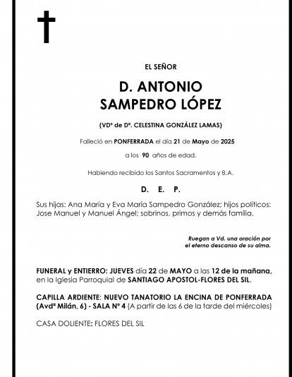 Esquelas ANTONIO SAMPEDRO LOPEZ Redacción Infobierzo 21 de Mayo de 2025 Comentarios Guardar ANTONIO SAMPEDRO LOPEZ Temas Esquelas Bierzo Esquelas Ponferrada Esquelas