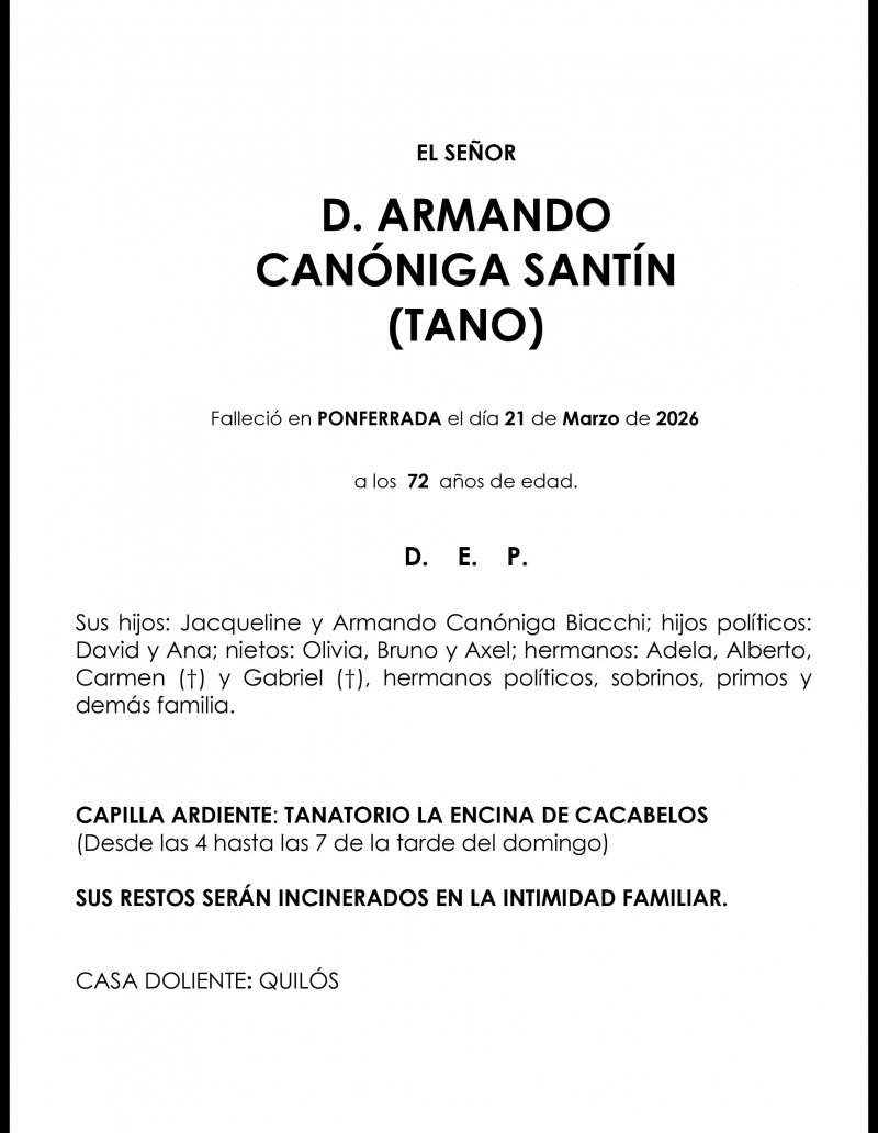Esquelas ARMANDO CANÓNIGA SANTÍN Redacción Infobierzo 21 de Marzo de 2026 Actualizado: 21 de Marzo de 2026 a las 20:04 Comentarios Guardar ARMANDO CANÓNIGA SANTÍN ARMANDO CANÓNIGA SANTÍN Temas Esquelas Bierzo Esquelas Ponferrada Esquelas