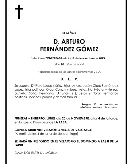 Esquelas ARTURO FERNANDEZ GOMEZ 20 de Noviembre de 2023 Comentarios Guardar ARTURO FERNANDEZ GOMEZ Temas Esquelas Bierzo Esquelas Ponferrada Esquelas