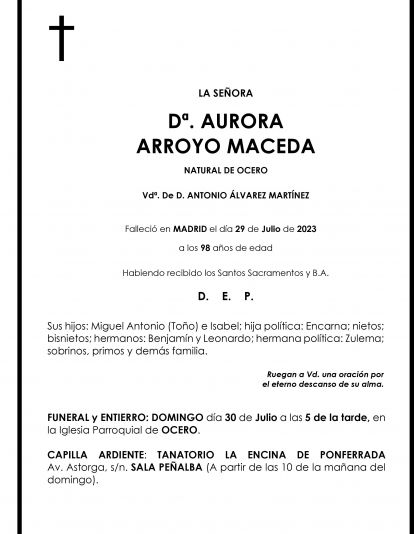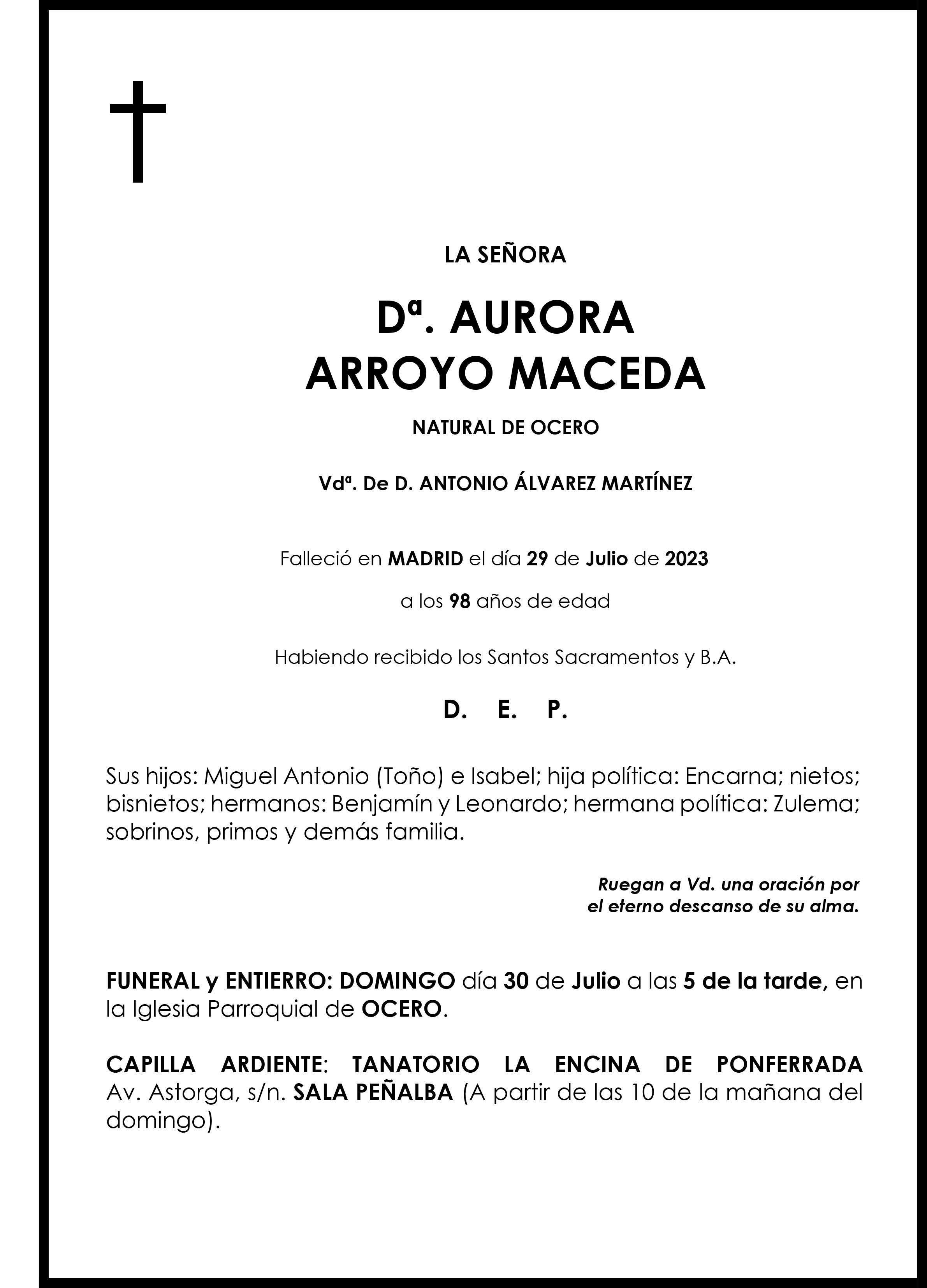 Esquelas AURORA ARROYO MACEDA 29 de Julio de 2023 Comentarios Guardar AURORA ARROYO MACEDA Temas Esquelas