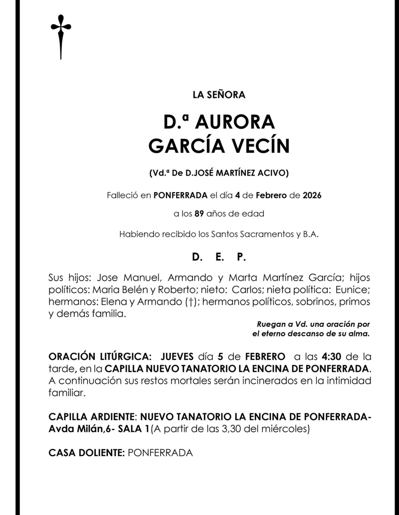 Esquelas AURORA GARCÍA VECÍN Redacción Infobierzo 04 de Febrero de 2026 Actualizado: 04 de Febrero de 2026 a las 19:04 Comentarios Guardar AURORA GARCÍA VECÍN AURORA GARCÍA VECÍN Temas Esquelas Ponferrada Esquelas Bierzo Esquelas