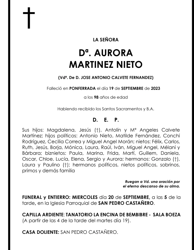 Esquelas AURORA MARTINEZ NIETO 19 de Septiembre de 2023 Comentarios Guardar AURORA MARTINEZ NIETO Temas Esquelas Bierzo Esquelas Ponferrada Esquelas