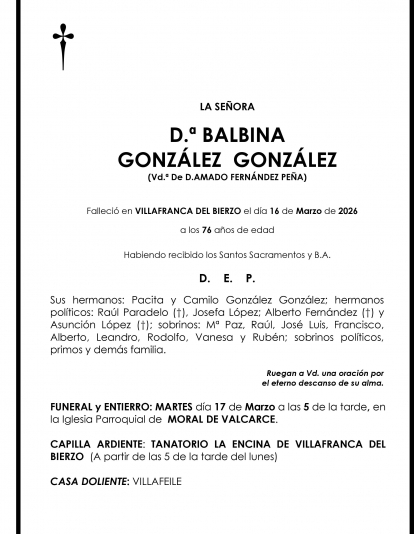 Esquelas BALBINA GONZALEZ GONZALEZ Redacción Infobierzo 16 de Marzo de 2026 Actualizado: 16 de Marzo de 2026 a las 16:29 Comentarios Guardar BALBINA GONZALEZ GONZALEZ BALBINA GONZALEZ GONZALEZ Temas Esquelas Bierzo Esquelas Ponferrada Esquelas