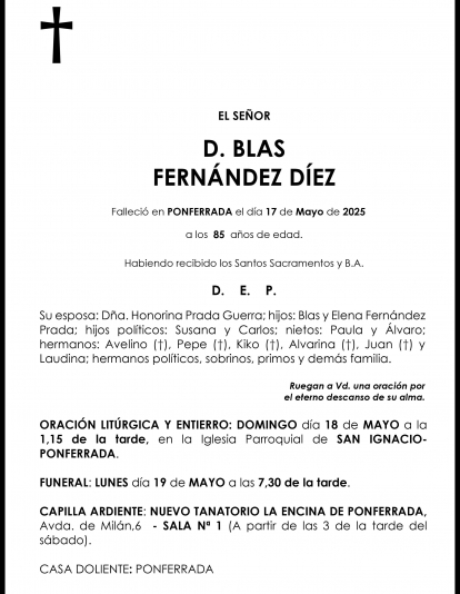 Esquelas BLAS FERNANDEZ DIEZ Redacción Infobierzo 17 de Mayo de 2025 Comentarios Guardar BLAS FERNANDEZ DIEZ Temas Esquelas Bierzo Esquelas Ponferrada Esquelas