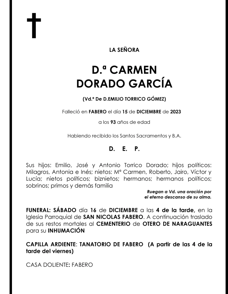 Esquelas CARMEN DORADO GARCIA 15 de Diciembre de 2023 Comentarios Guardar CARMEN DORADO GARCIA Temas Esquelas Bierzo Esquelas Ponferrada Esquelas