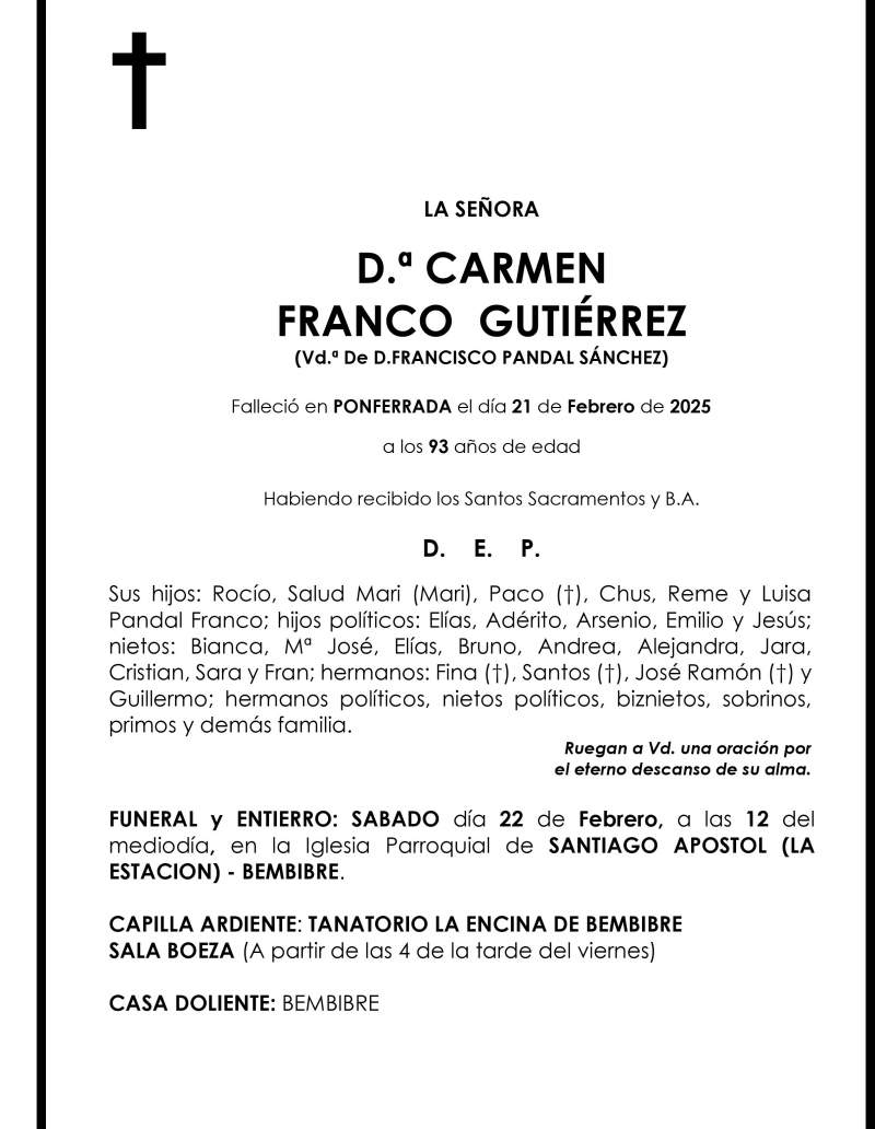 Esquelas CARMEN FRANCO GUTIERREZ Redacción Infobierzo 21 de Febrero de 2025 Comentarios Guardar CARMEN FRANCO GUTIERREZ Temas Esquelas Bierzo Esquelas Ponferrada Esquelas