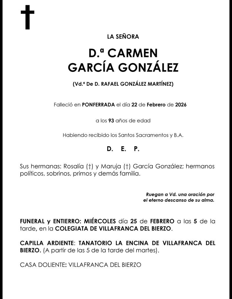 Esquelas CARMEN GARCÍA GONZÁLEZ Redacción Infobierzo 23 de Febrero de 2026 Actualizado: 23 de Febrero de 2026 a las 18:43 Comentarios Guardar CARMEN GARCÍA GONZÁLEZ CARMEN GARCÍA GONZÁLEZ Temas Esquelas Bierzo Esquelas Ponferrada Esquelas