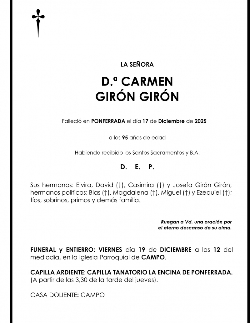 Esquelas CARMEN GIRON GIRON Redacción Infobierzo 18 de Diciembre de 2025 Actualizado: 18 de Diciembre de 2025 a las 17:59 Comentarios Guardar CARMEN GIRON GIRON CARMEN GIRON GIRON Temas Esquelas Bierzo Esquelas Ponferrada Esquelas