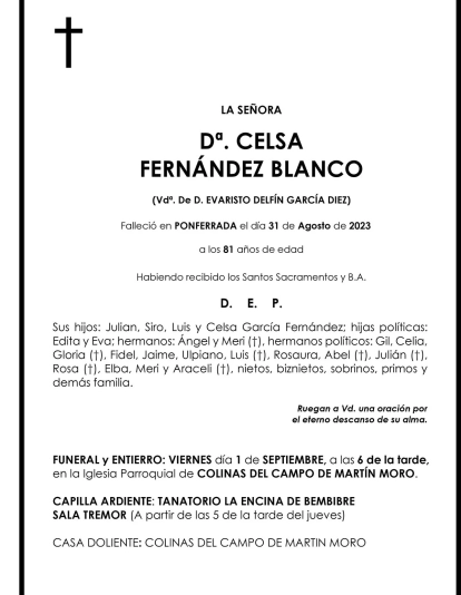 Esquelas CELSA FERNANDEZ BLANCO 31 de Agosto de 2023 Comentarios Guardar CELSA FERNANDEZ BLANCO Temas Esquelas Bierzo