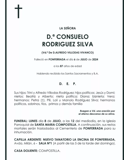 Esquelas CONSUELO RODRIGUEZ SILVA 07 de Julio de 2024 Comentarios Guardar CONSUELO RODRIGUEZ SILVA Temas Esquelas Bierzo Esquelas Ponferrada Esquelas