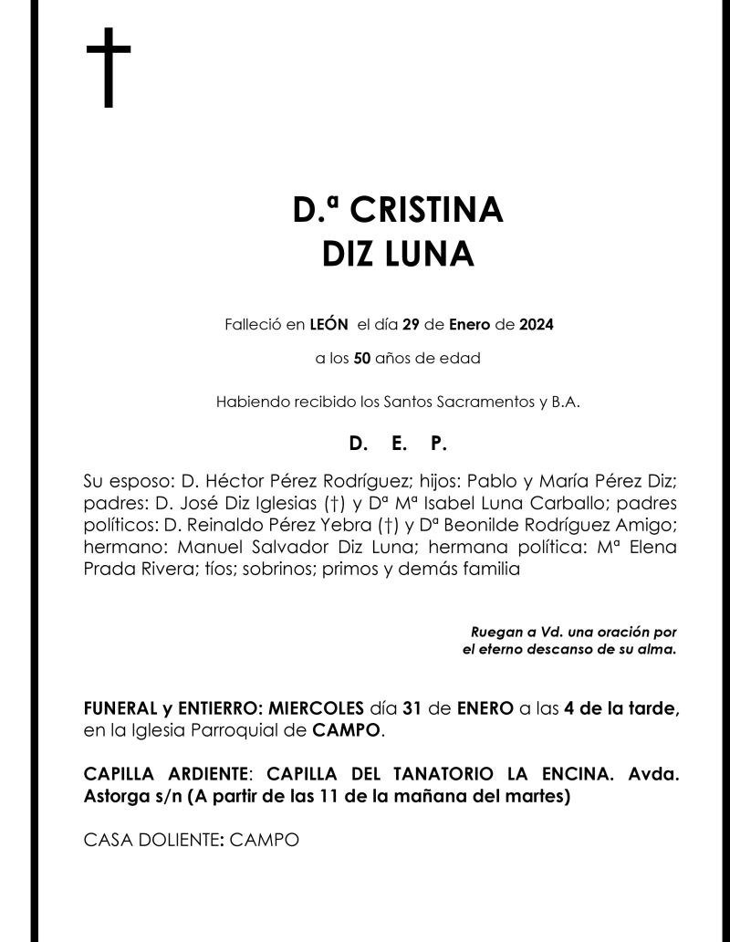 Esquelas CRISTINA DIZ LUNA 30 de Enero de 2024 Comentarios Guardar CRISTINA DIZ LUNA Temas Esquelas Bierzo Esquelas Ponferrada Esquelas