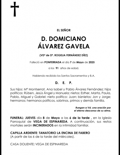 Esquelas DOMICIANO ÁLVAREZ GAVELA Redacción Infobierzo 07 de Mayo de 2025 Comentarios Guardar DOMICIANO ÁLVAREZ GAVELA Temas Esquelas Bierzo Esquelas Ponferrada Esquelas