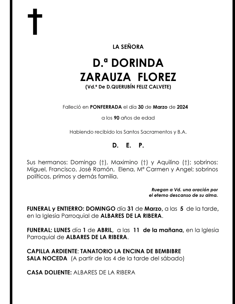 Esquelas DORINDA ZARAUZA FLORES 30 de Marzo de 2024 Comentarios Guardar DORINDA ZARAUZA FLORES Temas Esquelas Bierzo Esquelas Ponferrada Esquelas