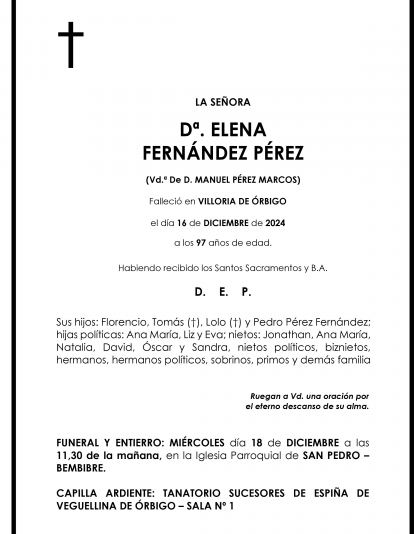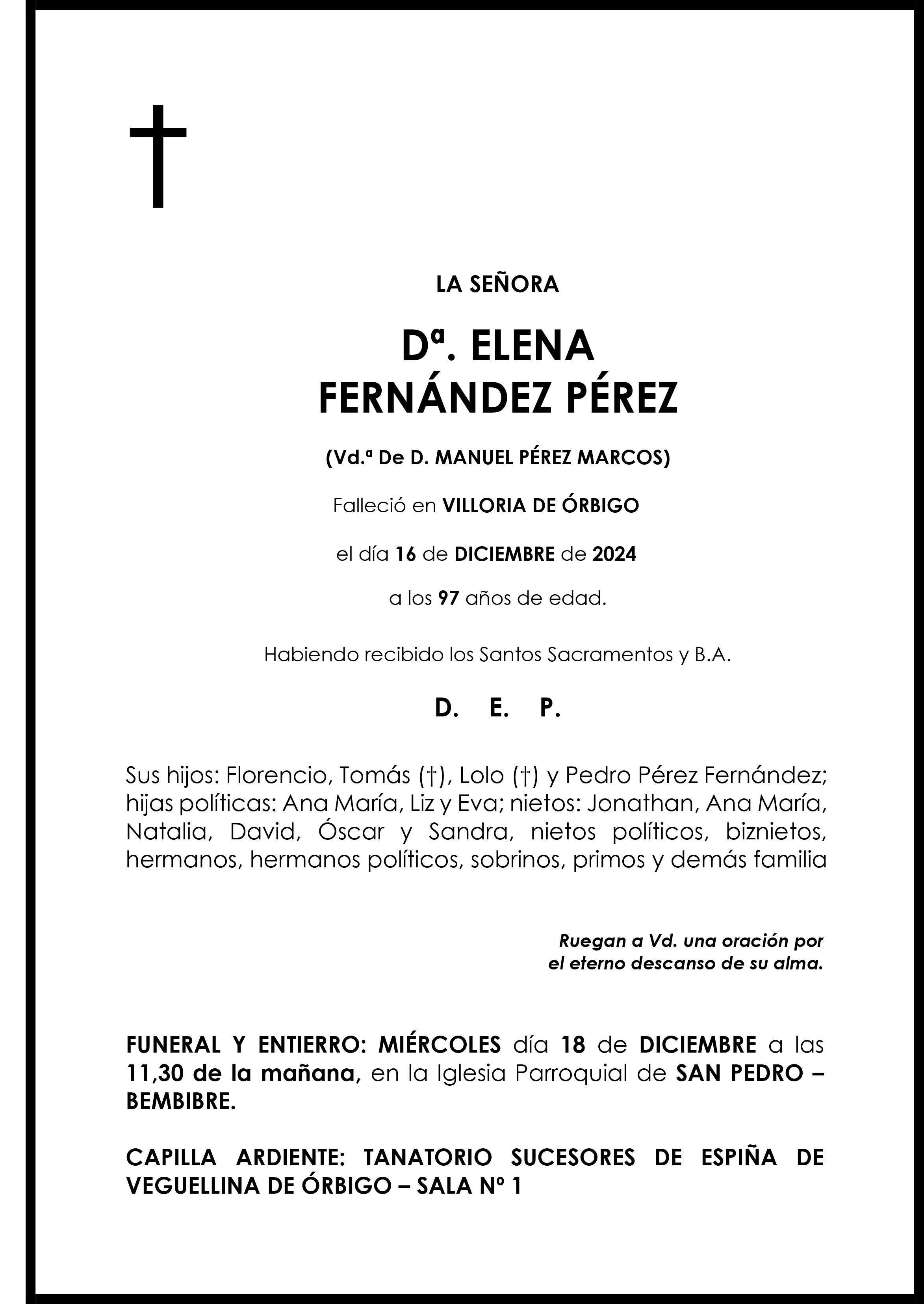 Esquelas ELENA FERNANDEZ PEREZ Redacción Infobierzo 17 de Diciembre de 2024 Comentarios Guardar ELENA FERNANDEZ PEREZ Temas Esquelas Bierzo Esquelas Ponferrada Esquelas