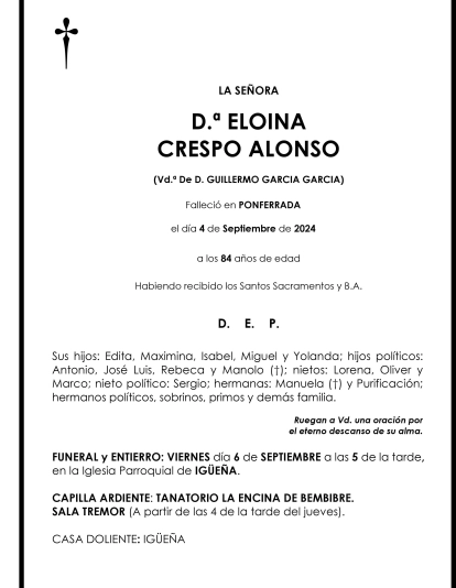 Esquelas ELOINA CRESPO ALONSO 05 de Septiembre de 2024 Comentarios Guardar ELOINA CRESPO ALONSO Temas Esquelas Bierzo Esquelas Ponferrada Esquelas