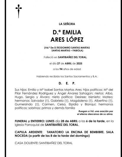 Esquelas EMILIA ARES LÓPEZ Redacción Infobierzo 27 de Abril de 2025 Comentarios Guardar EMILIA ARES LÓPEZ Temas Esquelas Bierzo Esquelas Ponferrada Esquelas