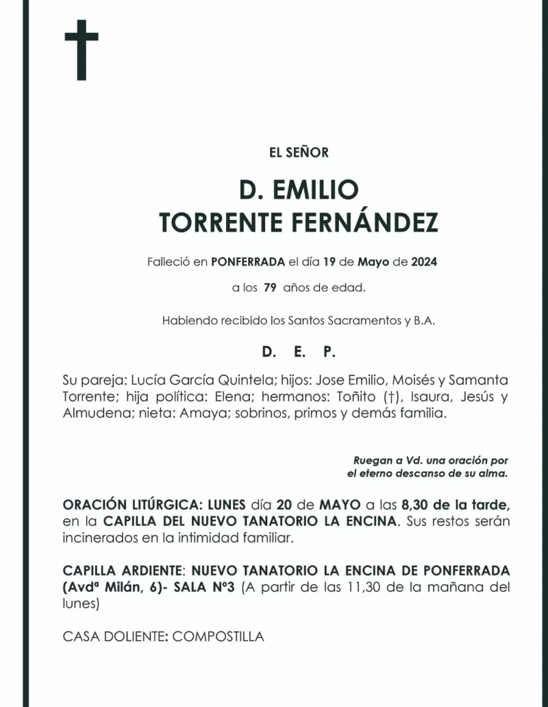 Esquelas EMILIO TORRENTE FERNANDEZ 19 de Mayo de 2024 Comentarios Guardar EMILIO TORRENTE FERNANDEZ Temas Esquelas Esquelas Ponferrada Esquelas Bierzo