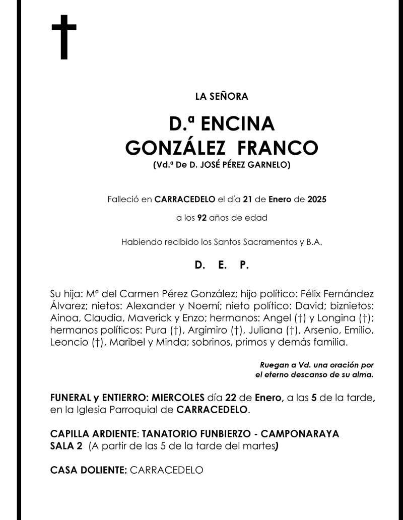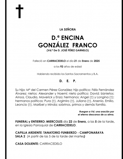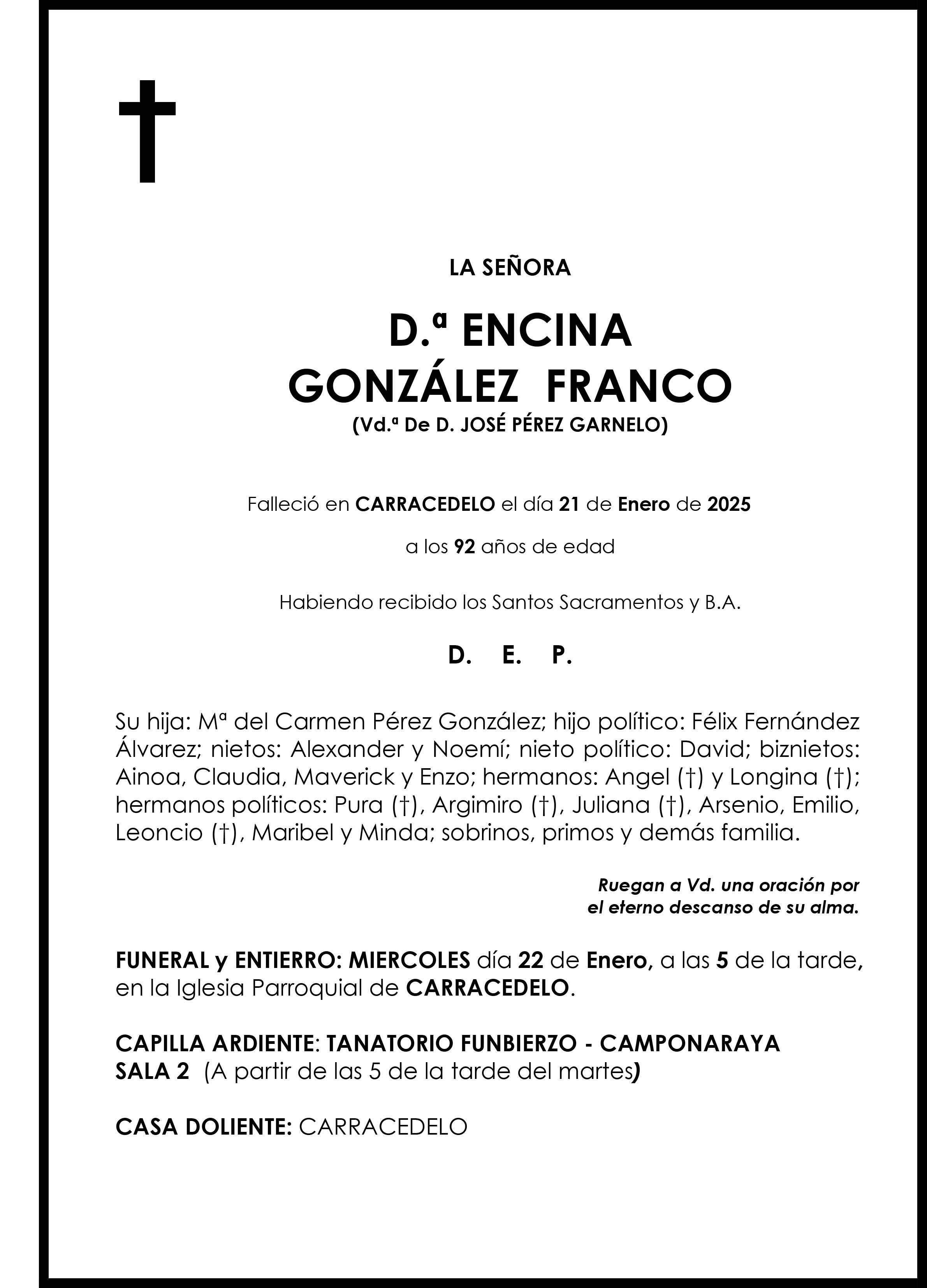 Esquelas ENCINA GONZALEZ FRANCO Redacción Infobierzo 21 de Enero de 2025 Comentarios Guardar ENCINA GONZALEZ FRANCO Temas Esquelas Bierzo Esquelas Ponferrada Esquelas