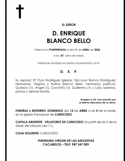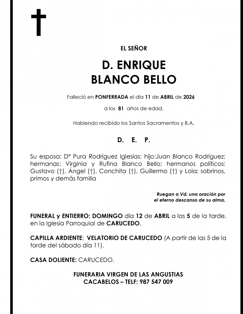 Esquelas ENRIQUE BLANCO BELLO Redacción Infobierzo 11 de Abril de 2026 Comentarios Guardar ENRIQUE BLANCO BELLO ENRIQUE BLANCO BELLO Temas Esquelas Bierzo Esquelas Ponferrada Esquelas