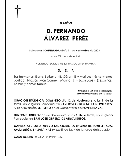 Esquelas FERNANDO ALVAREZ PEREZ 11 de Noviembre de 2023 Comentarios Guardar FERNANDO ALVAREZ PEREZ Temas Esquelas Bierzo Esquelas Ponferrada Esquelas