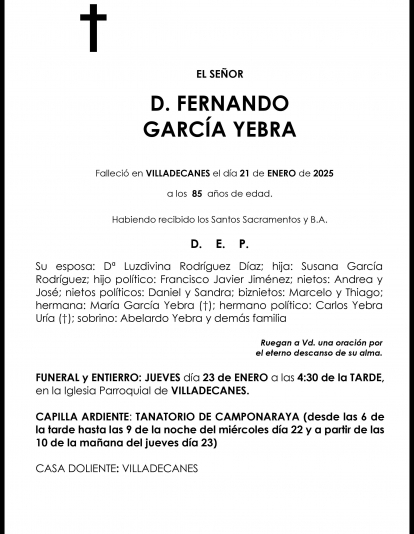 Esquelas FERNANDO GARCIA YEBRA Redacción Infobierzo 21 de Enero de 2025 Comentarios Guardar FERNANDO GARCIA YEBRA Temas Esquelas Bierzo Esquelas Ponferrada Esquelas