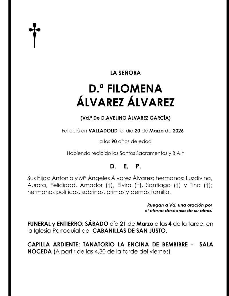 Esquelas FILOMENA ÁLVAREZ ÁLVAREZ Redacción Infobierzo 20 de Marzo de 2026 Actualizado: 20 de Marzo de 2026 a las 17:55 Comentarios Guardar FILOMENA ÁLVAREZ ÁLVAREZ FILOMENA ÁLVAREZ ÁLVAREZ Temas Esquelas Bierzo Esquelas Ponferrada Esquelas