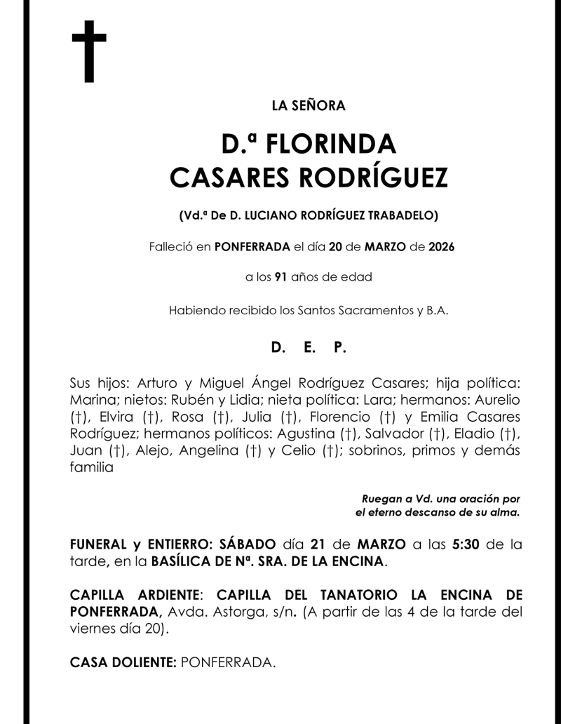 Esquelas FLORINDA CASARES RODRÍGUEZ Redacción Infobierzo 20 de Marzo de 2026 Actualizado: 20 de Marzo de 2026 a las 17:56 Comentarios Guardar FLORINDA CASARES RODRÍGUEZ FLORINDA CASARES RODRÍGUEZ Temas Esquelas Bierzo Esquelas Ponferrada Esquelas