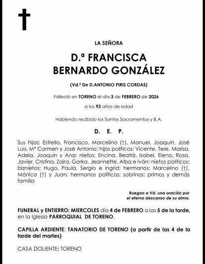 Esquelas FRANCISCA BERNARDO GONZÁLEZ Redacción Infobierzo 03 de Febrero de 2026 Actualizado: 03 de Febrero de 2026 a las 19:16 Comentarios Guardar FRANCISCA BERNARDO GONZÁLEZ FRANCISCA BERNARDO GONZÁLEZ Temas Esquelas Bierzo Esquelas Ponferrada Esquelas