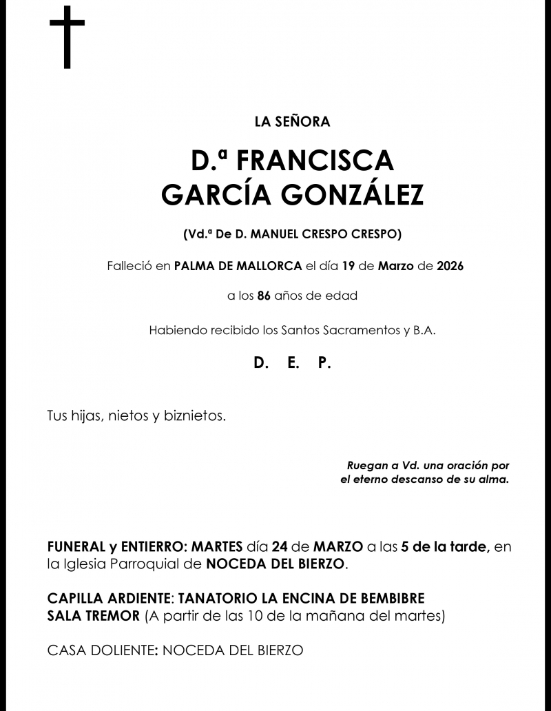 Esquelas FRANCISCA GARCÍA GONZÁLEZ Redacción Infobierzo 23 de Marzo de 2026 Actualizado: 23 de Marzo de 2026 a las 16:47 Comentarios Guardar FRANCISCA GARCÍA GONZÁLEZ FRANCISCA GARCÍA GONZÁLEZ Temas Esquelas Bierzo Esquelas Ponferrada Esquelas