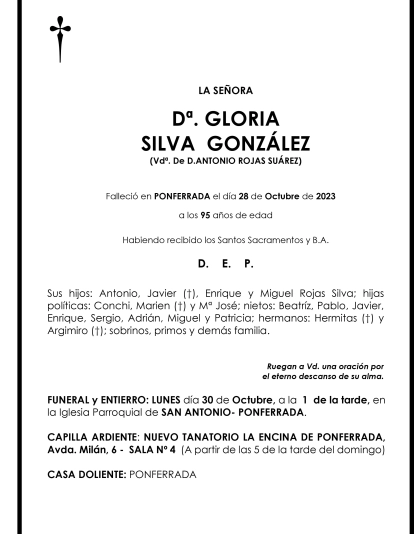 Esquelas GLORIA SILVA GONZALEZ 30 de Octubre de 2023 Comentarios Guardar GLORIA SILVA GONZALEZ Temas Esquelas Bierzo Esquelas Ponferrada Esquelas