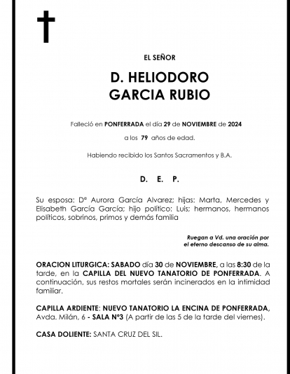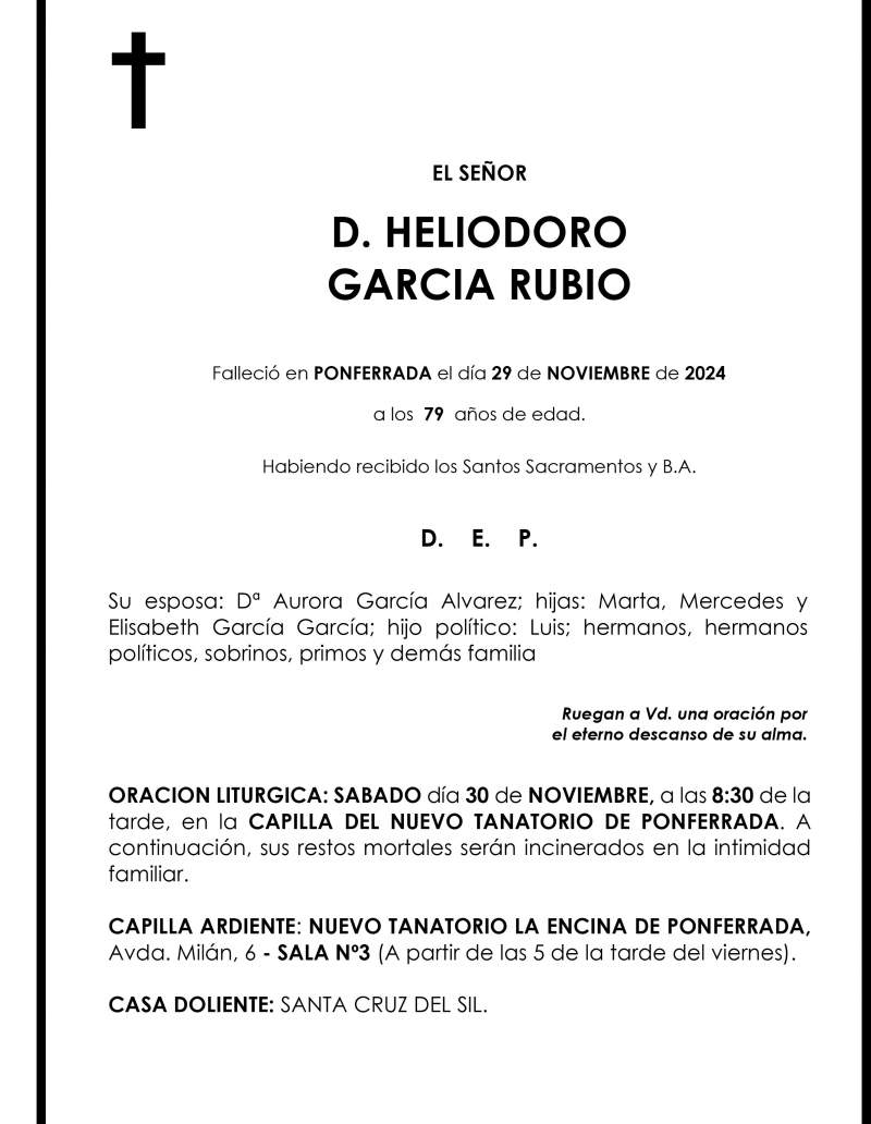 Esquelas HELIODORO GARCIA RUBIO Redacción Infobierzo 29 de Noviembre de 2024 Comentarios Guardar HELIODORO GARCIA RUBIO Temas Esquelas Bierzo Esquelas Ponferrada Esquelas