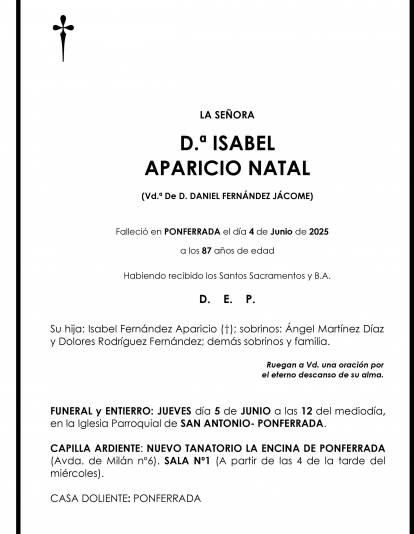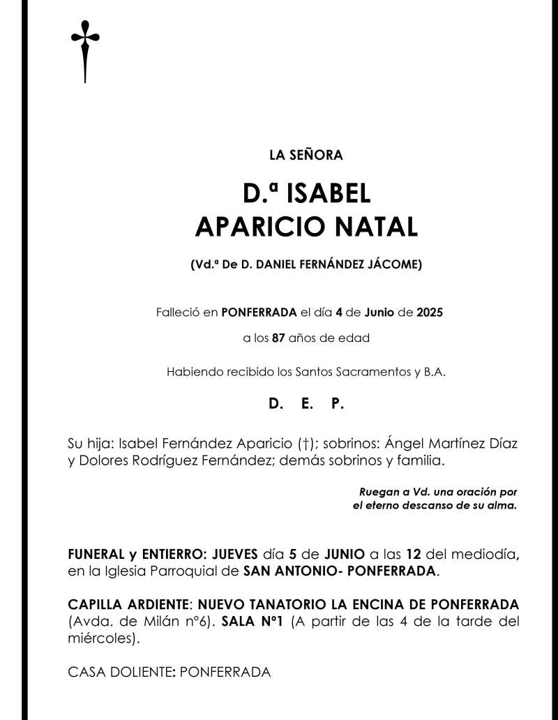 Esquelas ISABEL APARICIO NATAL Redacción Infobierzo 04 de Junio de 2025 Comentarios Guardar ISABEL APARICIO NATAL Temas Esquelas Bierzo Esquelas Ponferrada Esquelas