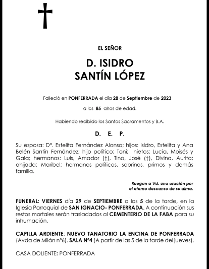 Esquelas ISIDRO SANTIN LOPEZ 28 de Septiembre de 2023 Comentarios Guardar ISIDRO SANTIN LOPEZ Temas Esquelas Bierzo Esquelas Ponferrada Esquelas