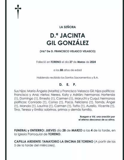 Esquelas JACINTA GIL GONZALEZ 27 de Marzo de 2024 Comentarios Guardar JACINTA GIL GONZALEZ Temas Esquelas Bierzo Esquelas Ponferrada Esquelas