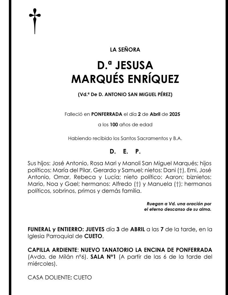 Esquelas JESUSA MARQUES ENRIQUEZ Redacción Infobierzo 02 de Abril de 2025 Comentarios Guardar JESUSA MARQUES ENRIQUEZ Temas Esquelas Bierzo Esquelas Ponferrada Esquelas